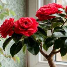 Камелия японская Крамерс Суприм выделяется своими сочными и ароматными тёмно-красными соцветиями.