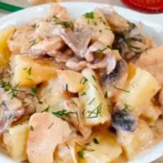 Кушанье идеально сочетает в себе сладость нежного свиного мяса, ароматы картофеля и насыщенного сливочного соуса с пикантными нотками чеснока.