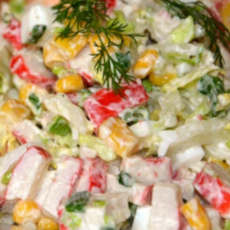Крабовый салат с капустой — это универсальное блюдо. Его можно подать на ужин как дополнение к основному блюду или гарнир к котлетам. А можно украсить зеленью и креветками и выставить на праздничный стол.