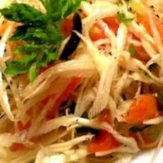 Блюдо, приготовленное по этому рецепту, напоминает популярный салат из капусты, который продаётся в столовых и в сетевых магазинах.