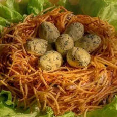 Салат «Гнездо глухаря» собирают в виде птичьего гнезда, и подобная подача блюда способна вызвать дикий восторг у гостей и членов семьи.
