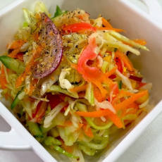 Капустный салат, приготовленный по этому рецепту, отличается необычным вкусом. В кушанье идеально сочетаются яркие овощи и пряные запахи чеснока и имбиря, что придаёт блюду экзотический вкус.