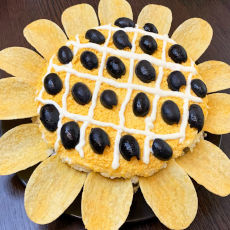 Этот вкусный и сытный салат подходит для праздничного и дружеского застолья. Блюдо оформляют в виде подсолнечника, что придаёт ему яркий вид и праздничное настроение.
