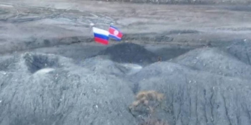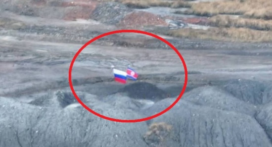 На терриконе у взятого под контроль российскими военными села Цукурино в ДНР был установлен «флаг КНДР» рядом с государственным флагом Российской Федерации. Снимок опубликовал Telegram-канал «Военкоры Русской Весны» («РВ»).