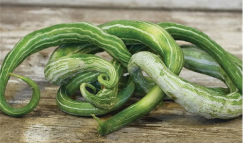- Плоды интересные, экзотические, загнуты кольцами (словно змеи), а в период спелости достигают длины 100 – 150 см. По вкусу напоминают сладкий редис, с лёгким огуречным ароматом.