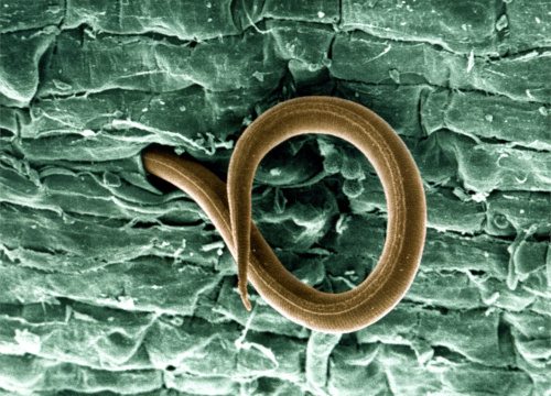 Нематоды (от греч. немас — «нить») – микроскопические вредители, относящиеся к классу круглых червей, который включает в себя около 20 тысяч видов. Тело у нематод длинное, суженное к концам, напоминает веретено. Нервная система примитивная, стволового типа — состоит из окологлоточного нервного кольца и нервных стволов. Органы чувств простейшие – на переднем конце тела имеются щетинки, воспринимающие прикосновение, и обонятельные ямки, могут быть слаборазвитые глаза. Размножаются нематоды, весьма традиционно, т. е. они раздельнополые. У самок наличествует по два яичника, два яйцевода, матка и половое отверстие, а у самцов — семенник и семяпровод.