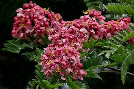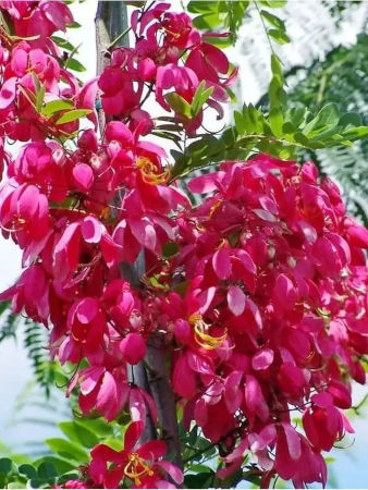 Кассия Камилла, также известная как Ренигера, в дикой природе достигает десяти метров в высоту, но в домашних условиях это тропическое дерево выращивают как комнатное растение, в горшке или в кадке. Крона у кассии пышная, плотная, образована широкими бархатистыми листьями. Во время цветения всё дерево покрывают пучки эффектных ярких розовых соцветий, за которые кассию красиво называют деревом «розового дождя». В природных условиях растение произрастает в жарком и влажном климате, поэтому при выращивании в домашних условиях кассию рекомендуется опрыскивать из пульверизатора. Зимой культуру держат при хорошей освещённости, в тёплом помещении, на солнечном месте и умеренно поливают. К составу грунтов растение нетребовательно, но предпочитает смеси с высоким содержанием песка. При содержании растений в контейнере летом важно правильно подобрать условия освещённости, не злоупотребляя прямыми солнечными лучами.
